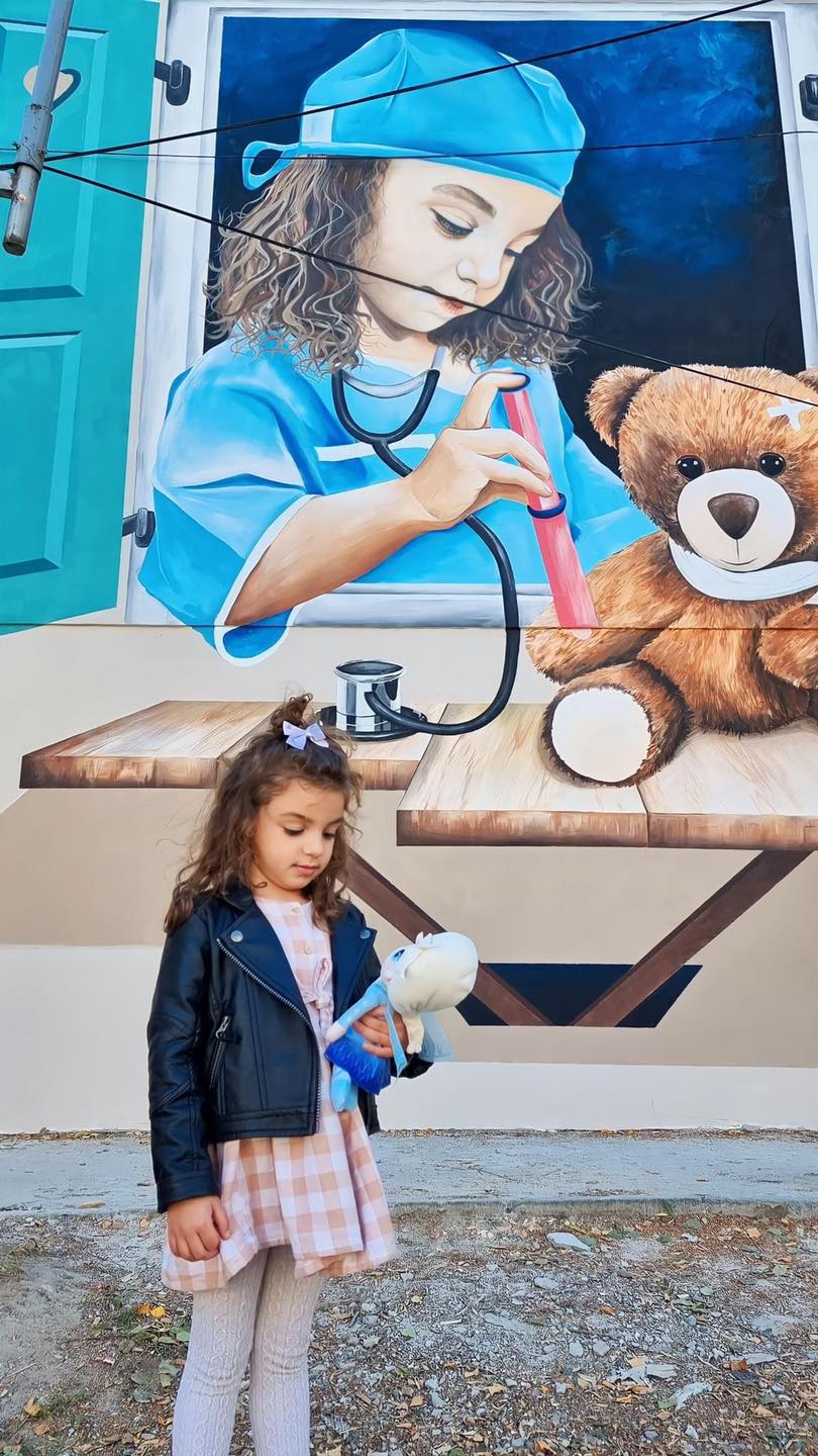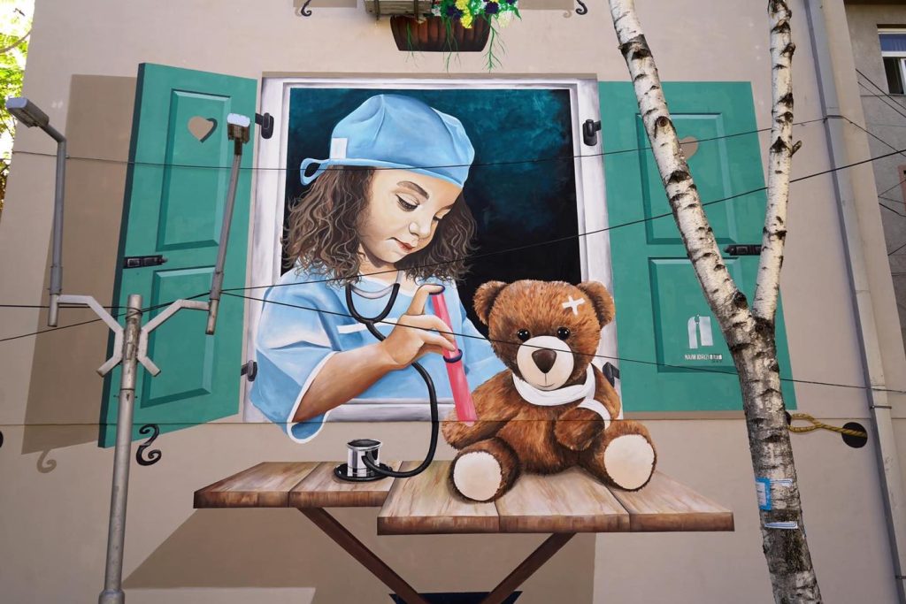 Muri tek Shtëpia e Shëndetit në Kumanovë me pamje të re, pas rrafshimit dhe fasadimit të saj, piktori z.Naim Idrizi ka paraqitur një vajz të vogël në rolin e infermierës duke vaksinuar një arush.